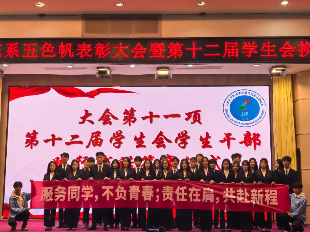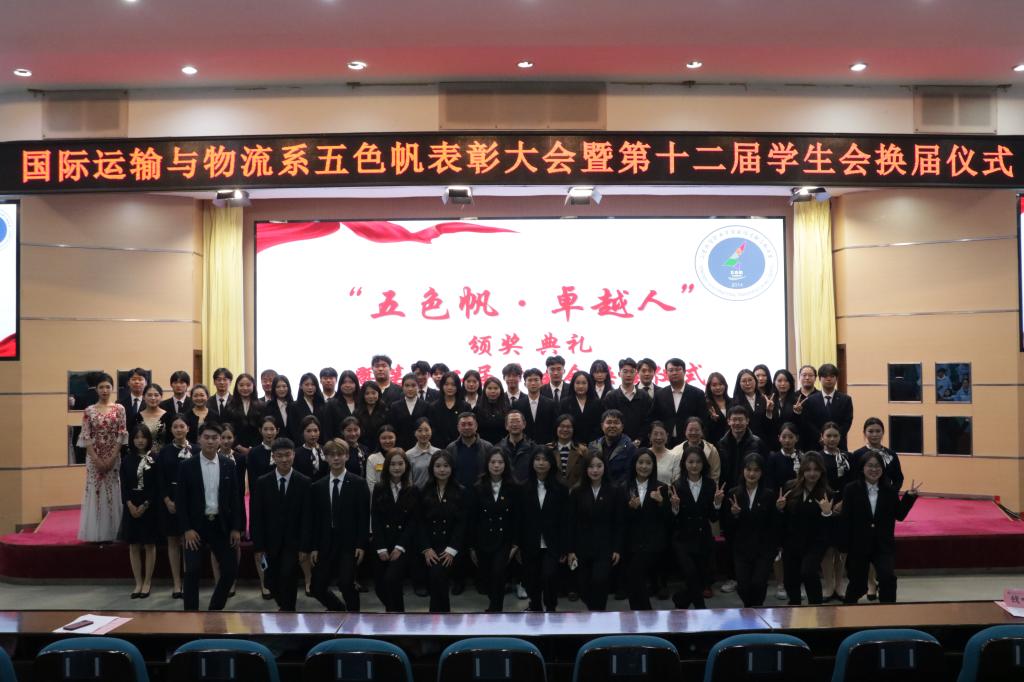 11 月 13 日,国际运输与物流系 2025 年度 “五色帆・卓越人” 颁奖典礼暨第十二届学生会换届仪式在学术报告厅举行,系全体领导老师及 400 余名学生代表参会。