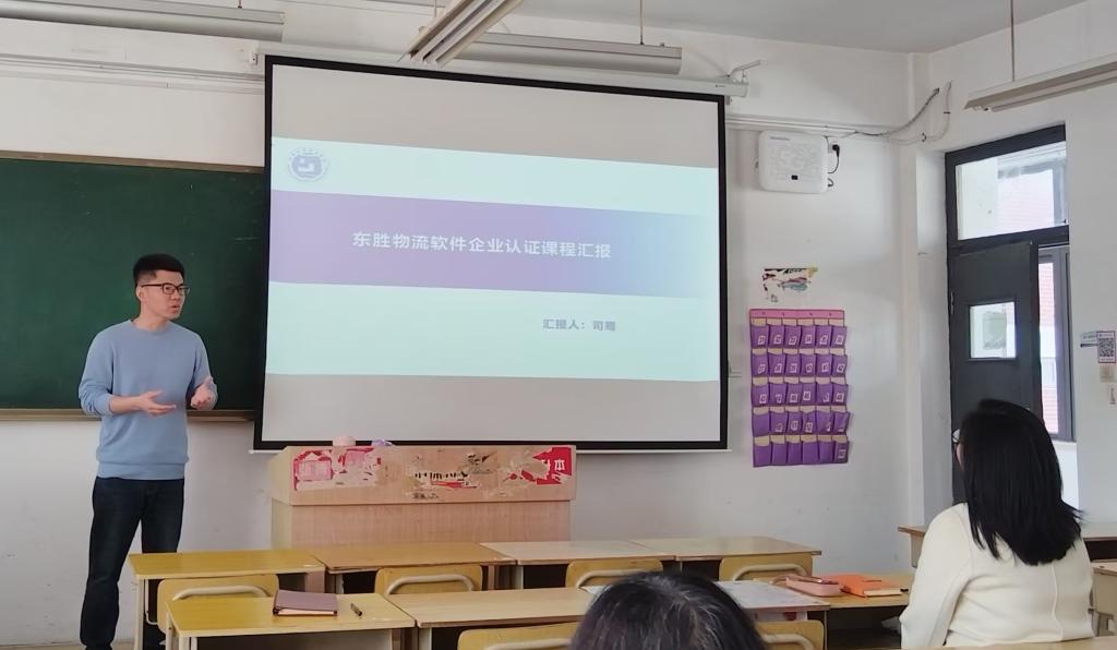 司骞老师以《东胜物流软件企业认证课程》为例,分享了校企合作课程开发经验。该课程与青岛东胜伟业软件有限公司深度合作,采用“校内导师讲理论+企业导师教实操”的双元模式,基于真实货代软件系统进行教学。课程最终共有20名学生通过认证并获得企业证书,成效显著。